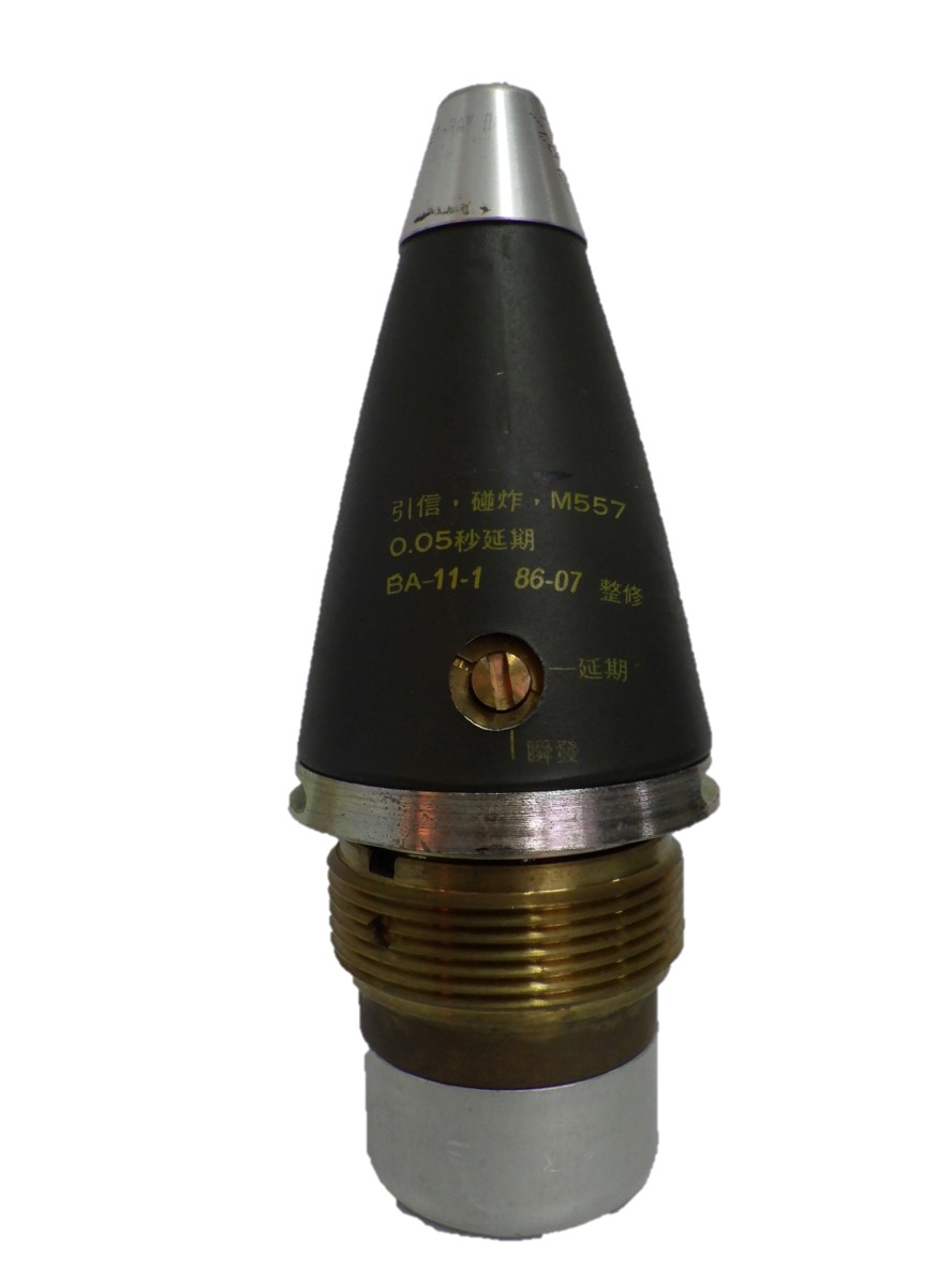 產品介紹: .型式:碰炸引信 .簡介:M557引信為一種可選擇瞬發或0.05秒延期的碰炸引信,設計適用於155公厘榴彈砲,105、155、240公厘榴砲,8吋榴砲及4.2吋迫砲等自旋穩定砲彈。 .規格: 引信全重:980公克 引信全長:158.6公厘 直徑:61公厘